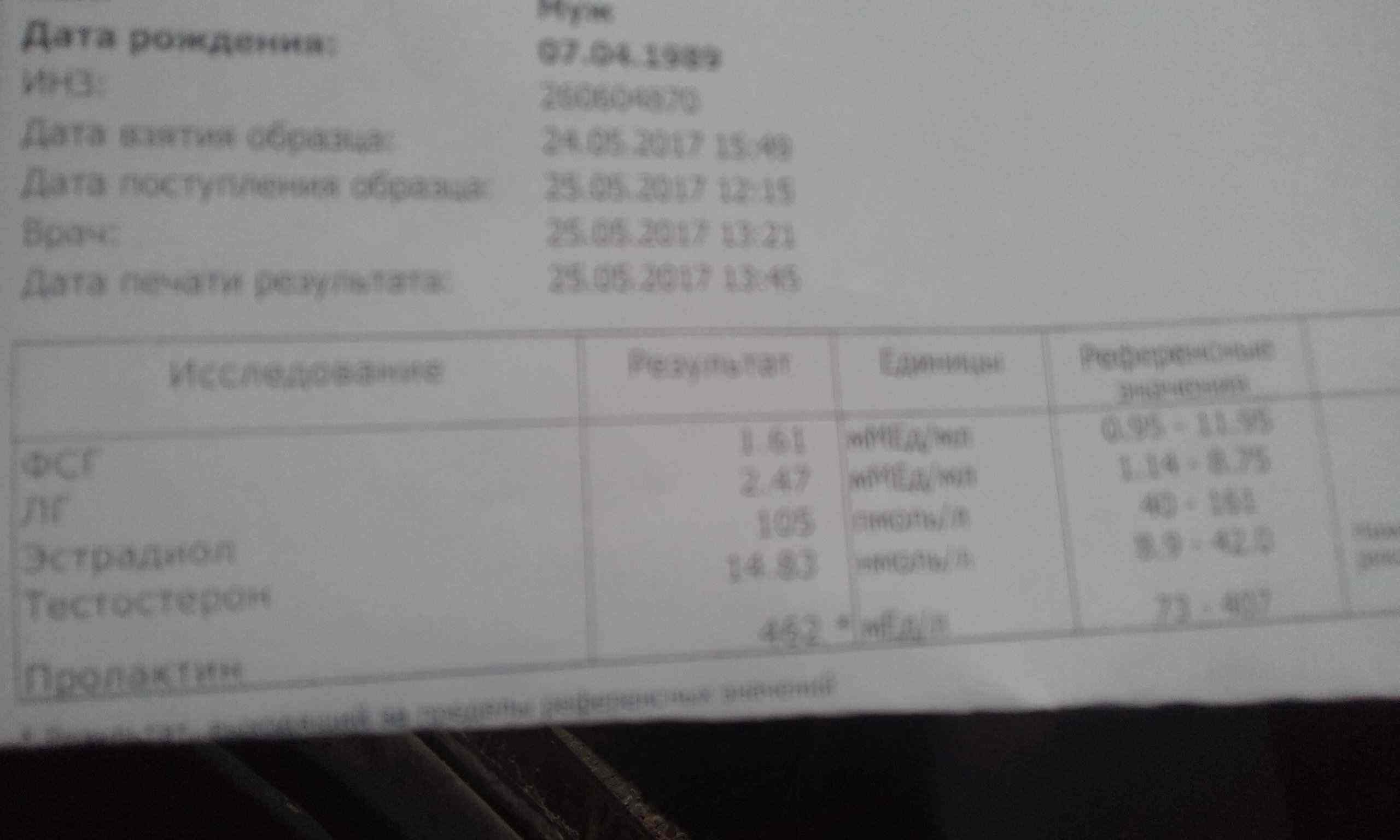 а в какой момент времени относительно приема кломида сданы анализы?Курс был 2 месяца тест 100ч/день и турик 30мг ,пкт кломид100мг 10дней ,вот такие анализы ИсследованиеРезультатРеференсные значенияКомментарийЛГ 6.48 ммед/мл1.14 - 8.75 мМЕд/млЭстрадиол 37 пмоль/л40 - 161 пмоль/лТестостерон 25.07 нмоль/л8.9 - 42.0 нмоль/лНижний диагностический порог, рекомендованный ISSAM: 12 нмоль/лПролактин 346 мед/л73 - 407 мЕд/л. Какие дальнейшие мои действия?