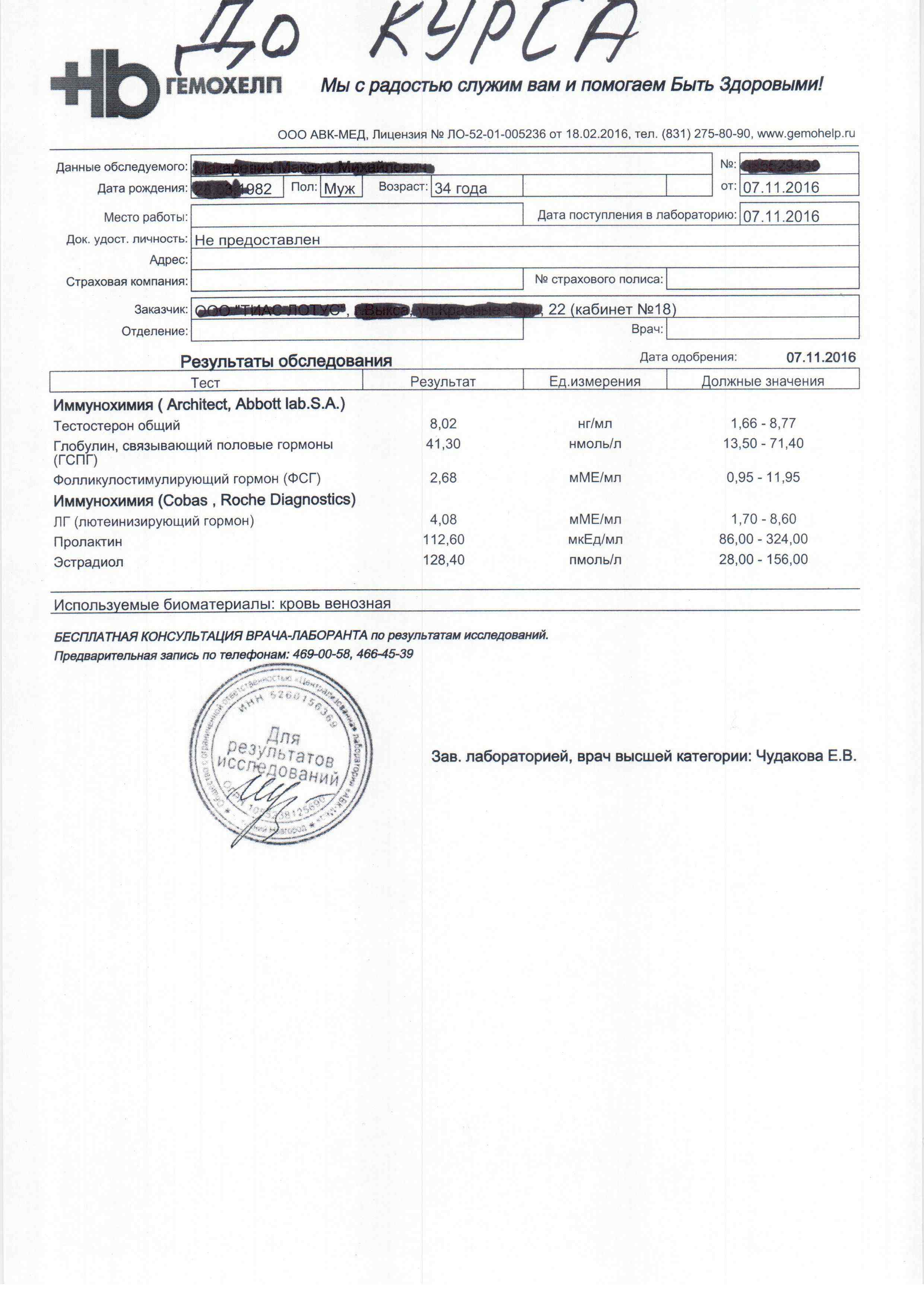 1) Анализы до курса: